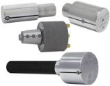 Air plug gages which are also referred to as an air probe, air spindle or mandrel are gages that are inserted into a work piece to obtain the internal diameter of a part. They are made of a precision ground hardened steel body incorporating two or more air gage nozzles. Air is passed through the probe body to the nozzles where a backpressure is produced by the surface of the workpiece. An air gage readout (air comparator) senses the resulting backpressure and displays the size of the workpiece. In the picture , the nozzle tips are recessed a small amount below the body of the probe. This feature makes the air gage measurement essentially non-contact; consequently, wear does not directly affect the accuracy of the gage measurement. In addition, the flow of air purges the gaging surface of contaminants making the measurements highly repeatable. By using an opposed set of nozzles, the measurement is made independent of how the operator positions the probe radially within the test bore. This "differential" type of measurement makes it possible to obtain extremely accurate measurements with limited operator skill. Air probe styles vary depending on how close the air jets are to the leading edge of the probe body. "Thru-hole" style probes have gaging nozzles located near the center of the probe body. "Blind" or "Super-blind" probe styles have nozzles located near the leading edge. Master ring gages are used to set air probes, bore gages and other internal measurement instruments. Master plug gages and master setting discs are used to calibrate air rings, snap gages, and other external measurement instruments.
